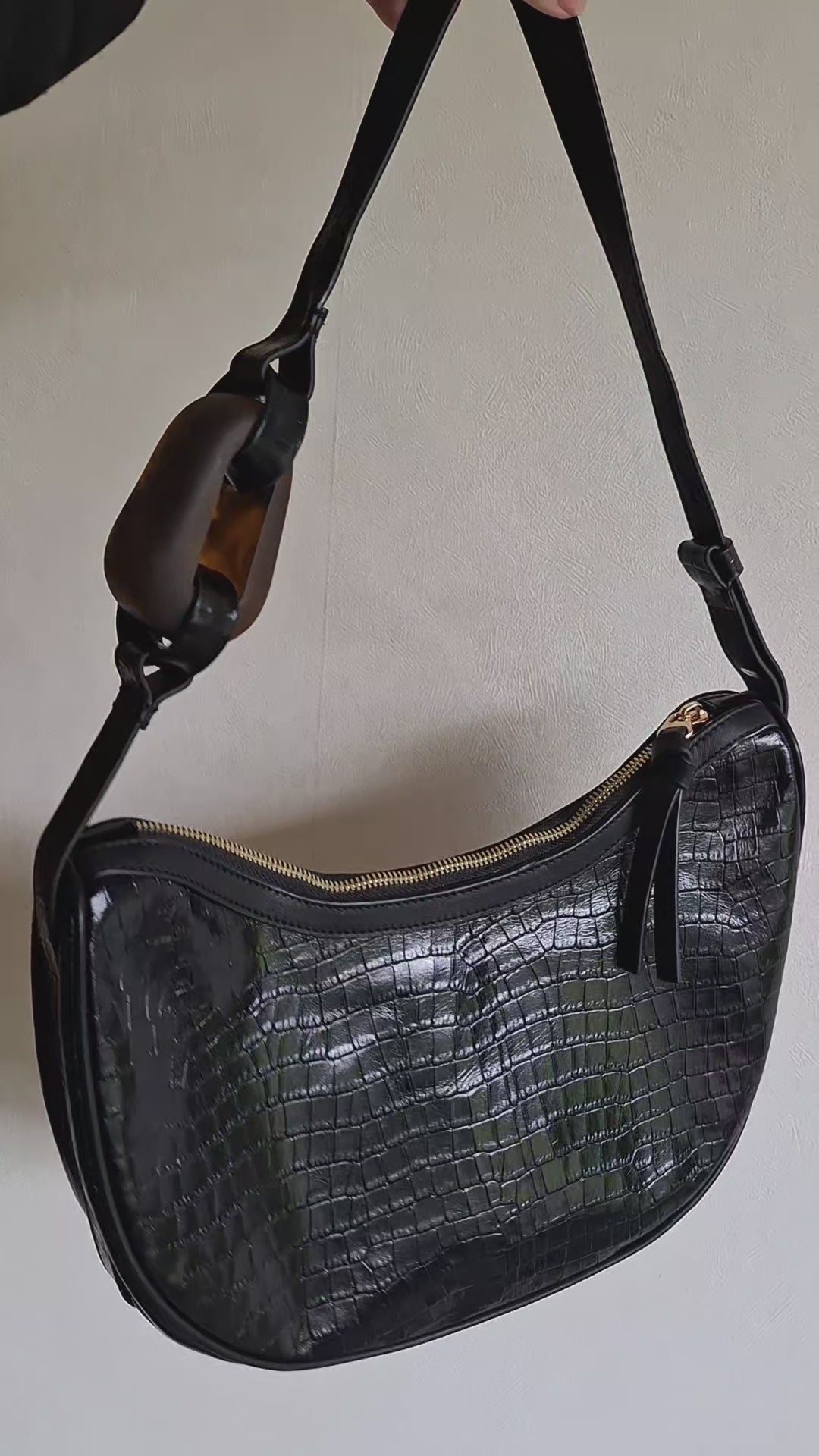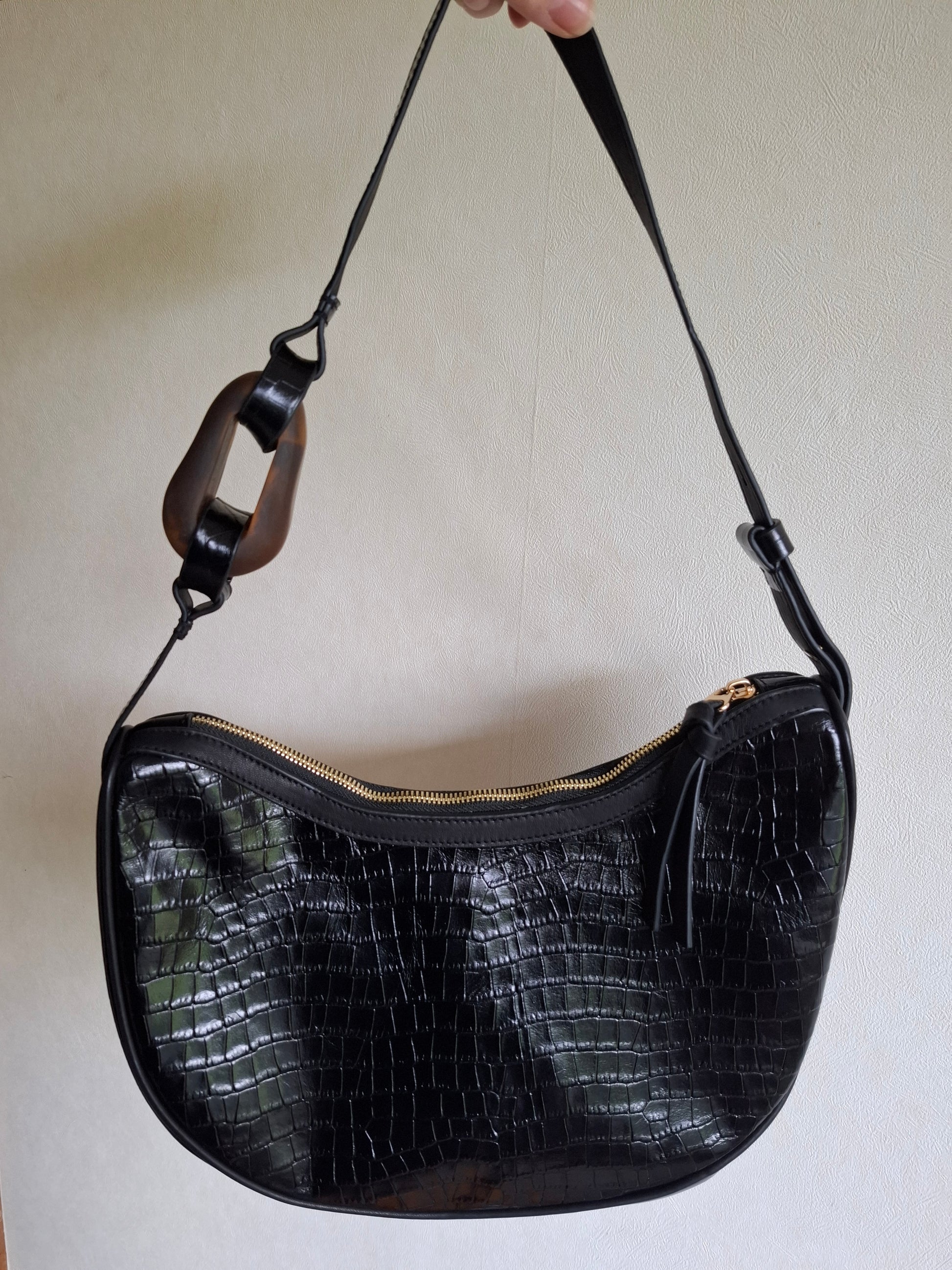 The Ichaa bag is hand crafted from croc embossed cow leather with an adjustable strap and featuring a resin bead for a classic design with a unique element.