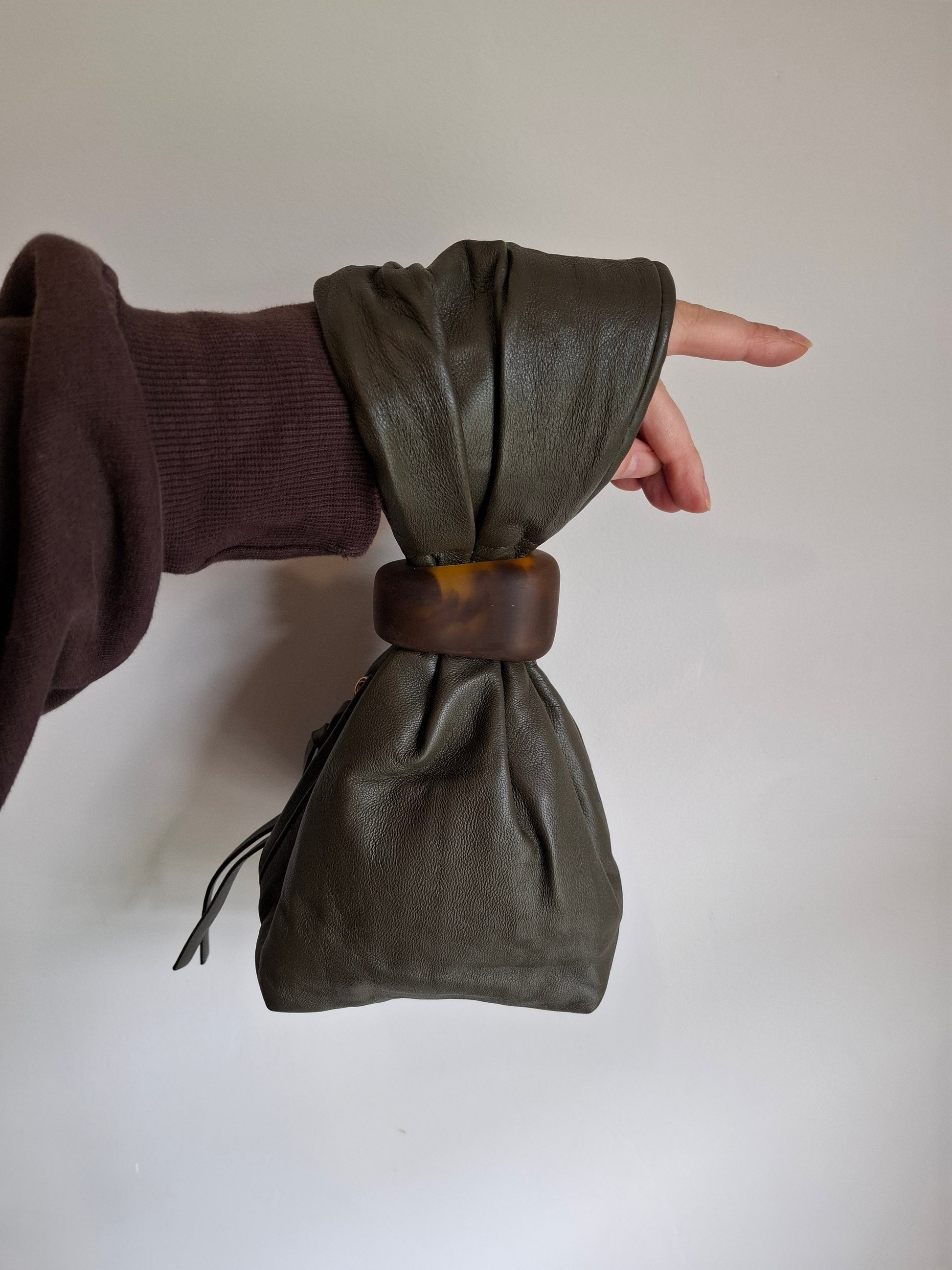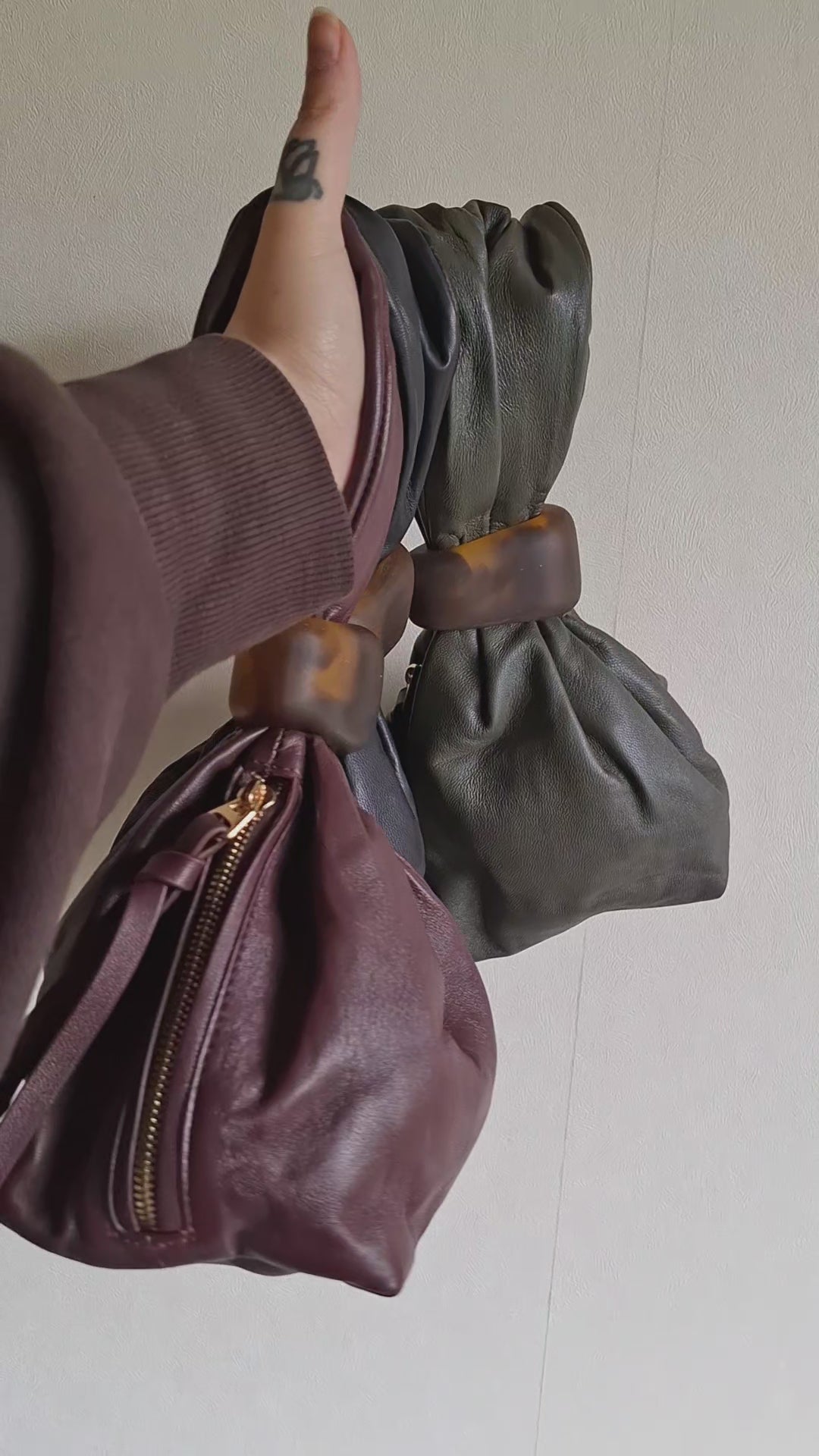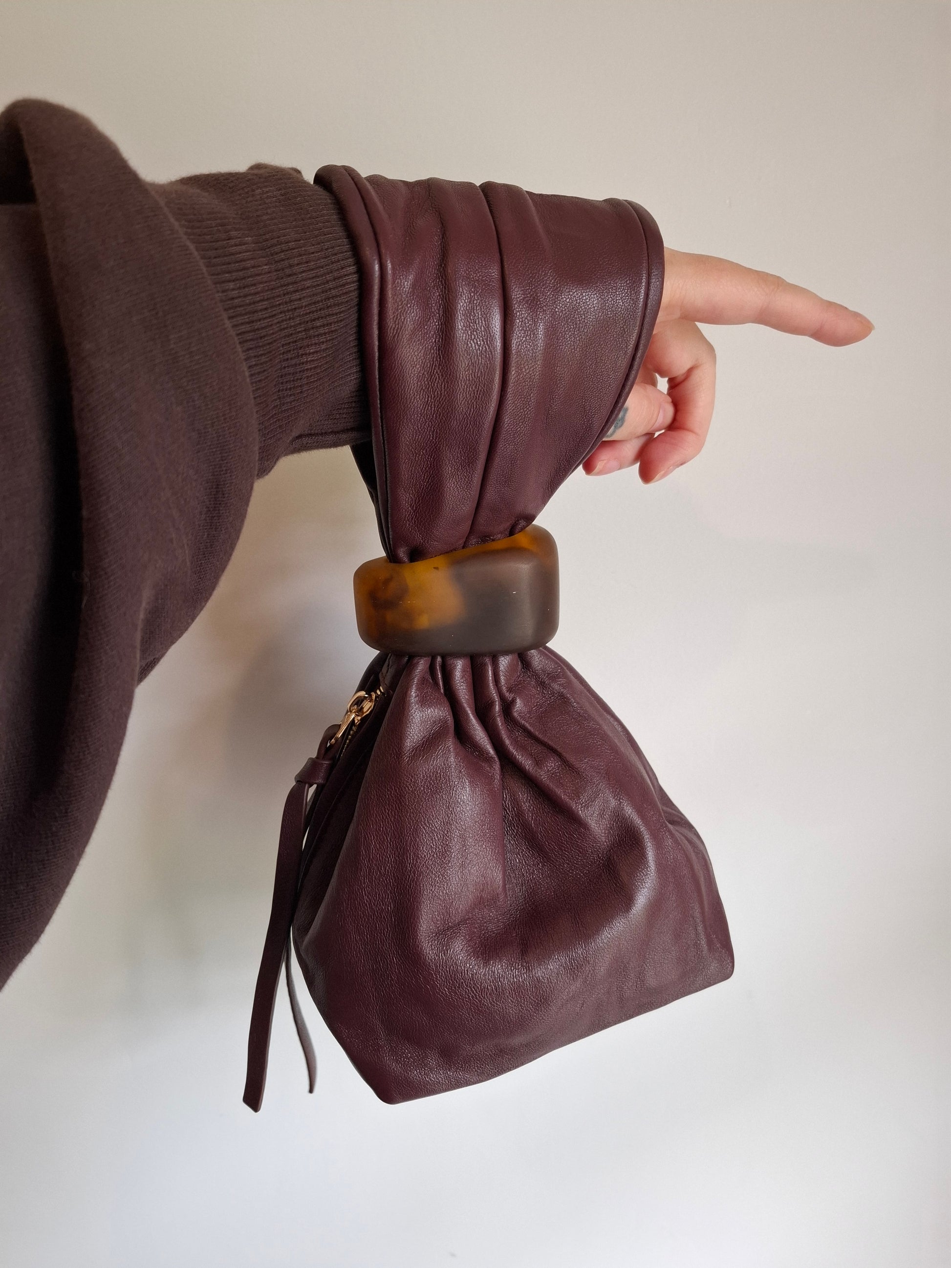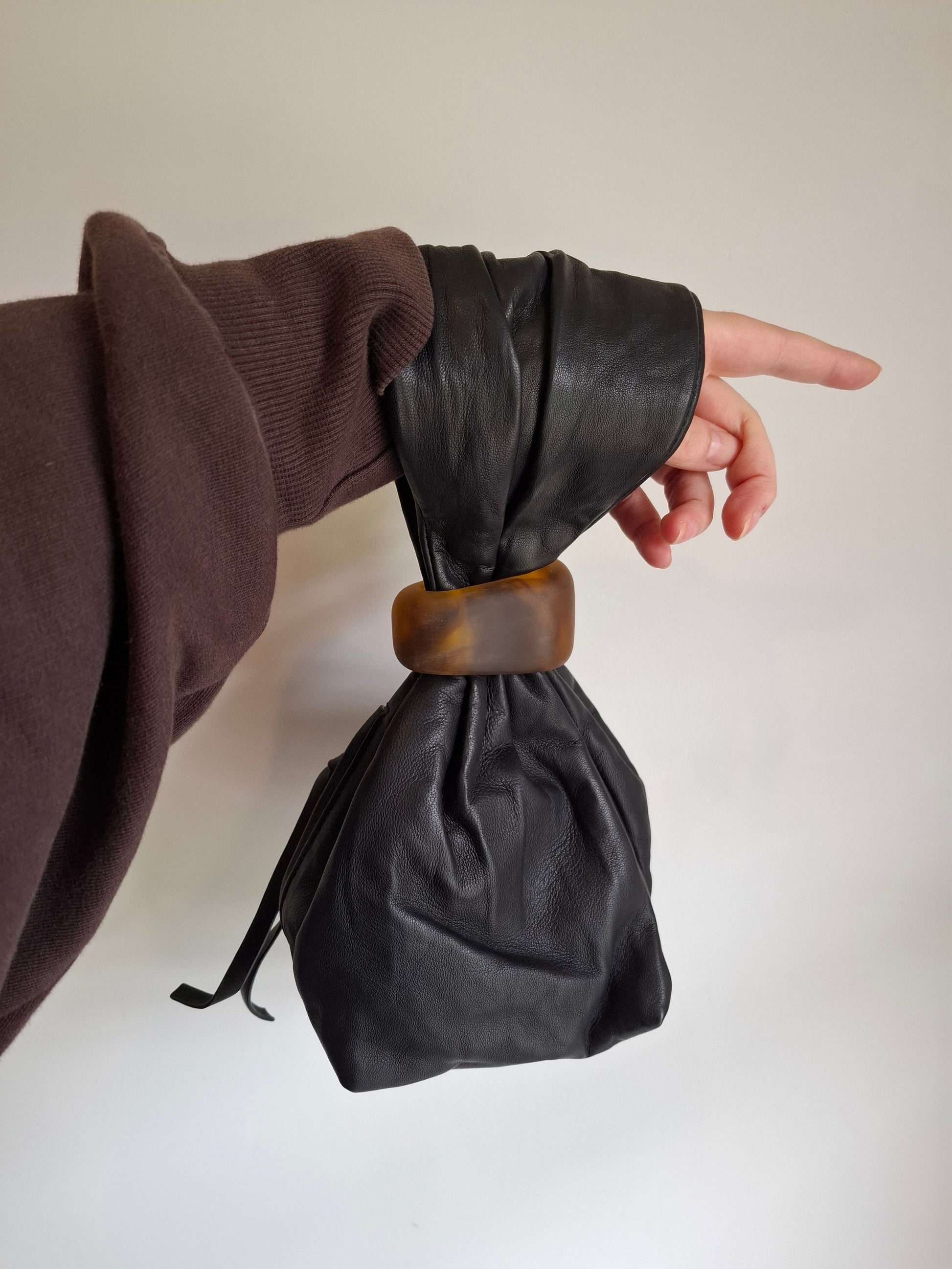 Hand crafted in buttery soft leather featuring a unique tort resin bead. Designed to sit comfortably over your wrist this bag is easy to wear and will elevate any outfit. Available in Burgandy, Olive or Black which one will you make yours?